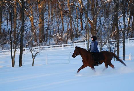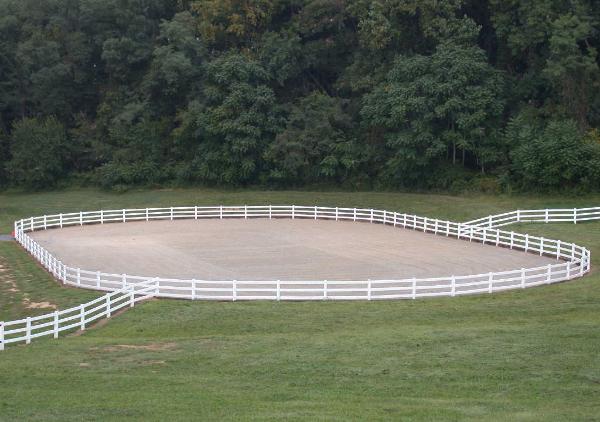 | Our ring was completed in the summer of 2006, and its dimensions are 110'x210'. The footing has fabulous drainage and is a uniform 3" of sand. The fencing around the ring is PVC, and the perimeter of the fence is lined with railroad ties to keep the footing level and in place. Outside the ring are jump standards, rails, and barrels. You will have plenty of room to practice any discipline you choose in a ring that is regularly groomed and maintained. |